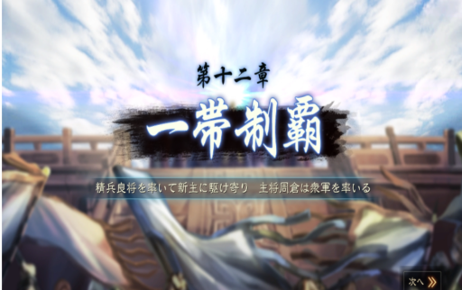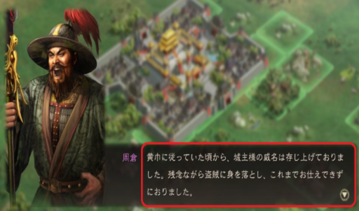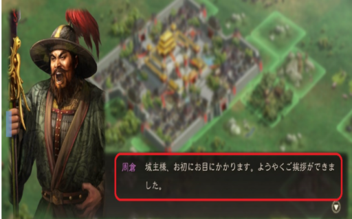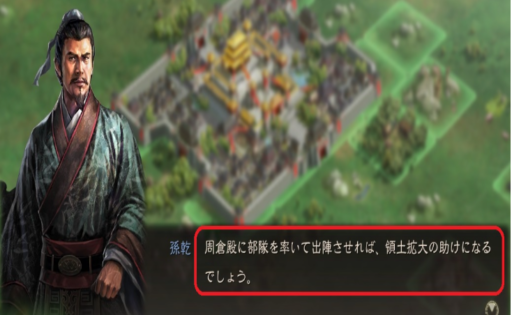 (第一章チュートリアルから参入の古参武将)孫乾が「(戦闘系武将の)周倉殿に部隊を率いて出陣させれば、領土拡大の助けになるでしょう。」と推挙し、