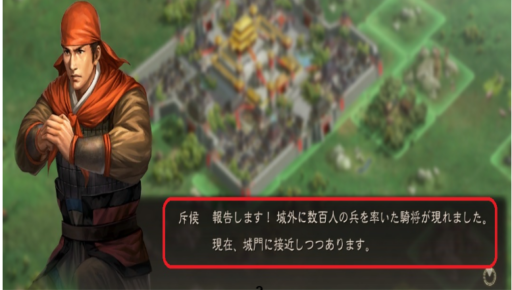 1)第十二章チュートリアルが始まると、斥候から「城外に数百人の兵を率いた騎将が現れました。現在、城門に接近しつつあります。」と報告が入ります。