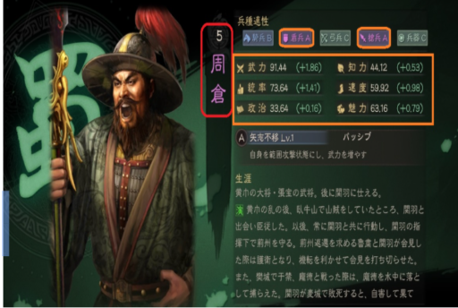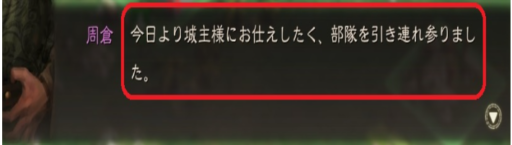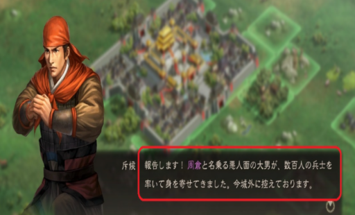 2)新たに斥候から「周倉(しゅう そう)と名乗る悪人面の大男が、数百人の兵士を率いて身を寄せてきました。 今城外に控えております。」との報告が入ります。