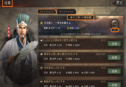 | ≪占領系≫ | 領地を占領し、『勢力値』を「5000」にする (報酬)名声 +500、銅貨 +5万 |