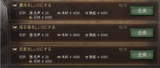 | ≪占領系≫ | 『Lv5』以上の土地を「10箇所」占領する (報酬)名声 +200、銅貨 +3万 |